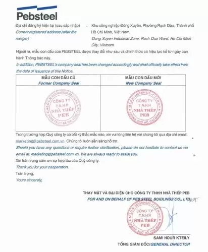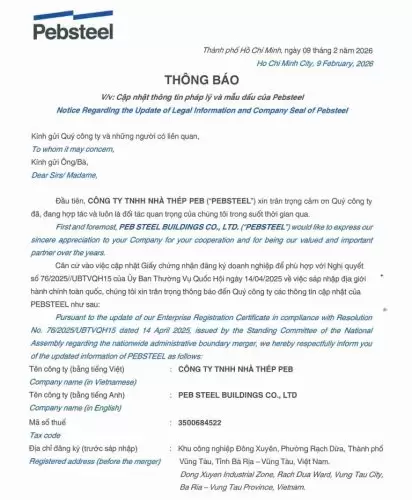 Following the merger, Pebsteel’s head office address has been updated as: Dong Xuyen Industrial Zone, Rach Dua Ward, Ho Chi Minh City, Vietnam.